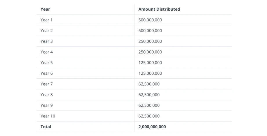 从 Maker 官网 Endgame 的代币经济学文档可知,每个 SubDAO 代币的初始供应量为 26 亿。其中 4 亿用于激励 SubDAO 员工;2 亿将在 2 年内出售为 DAI 为 SubDAO 提供资金;剩下的 20 亿将在 10 年时间内通过流动性挖矿的方式分发,具体分发时间表如下图所示。