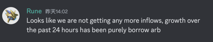 但随之也带来问题,Maker 希望是将尽可能多的资金分配给正常持有 DAI 的用户,但巨鲸的套利活动加大了 Maker 在 DSR 上的支出。Rune 也于 8 月 10 日在 Discord 中表示,过去 24 小时并没有资金流入,新增铸造的 DAI 和存入 DSR 合约的部分完全是为了借贷套利。