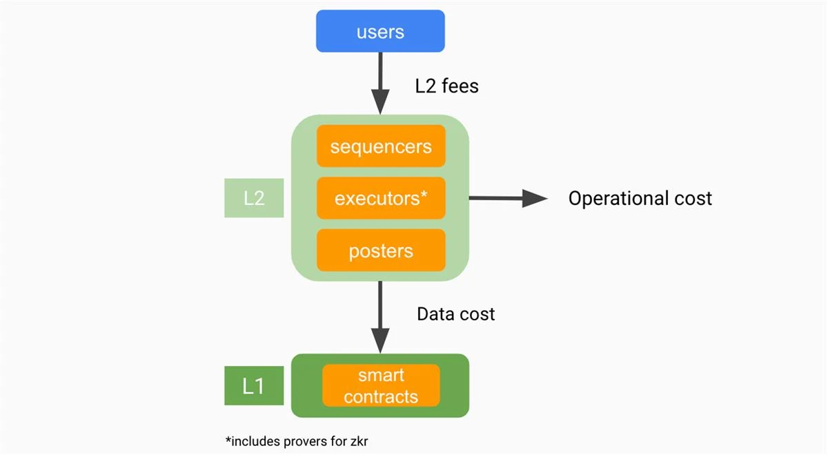 Rollup 成本结构:Rollup 运营商的成本现在包括运营成本、服务成本和数据发布成本。