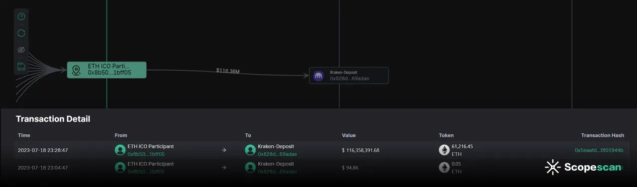 第一个事件涉及地址 0x 8 b 505 E 2871 F 7 dEb 7 a 63895208 e 8227 dcAa 1 Bff 05 ,该地址将 61, 216 个 ETH 转移到另一个地址,该地址将所有资金存入 Kraken 。