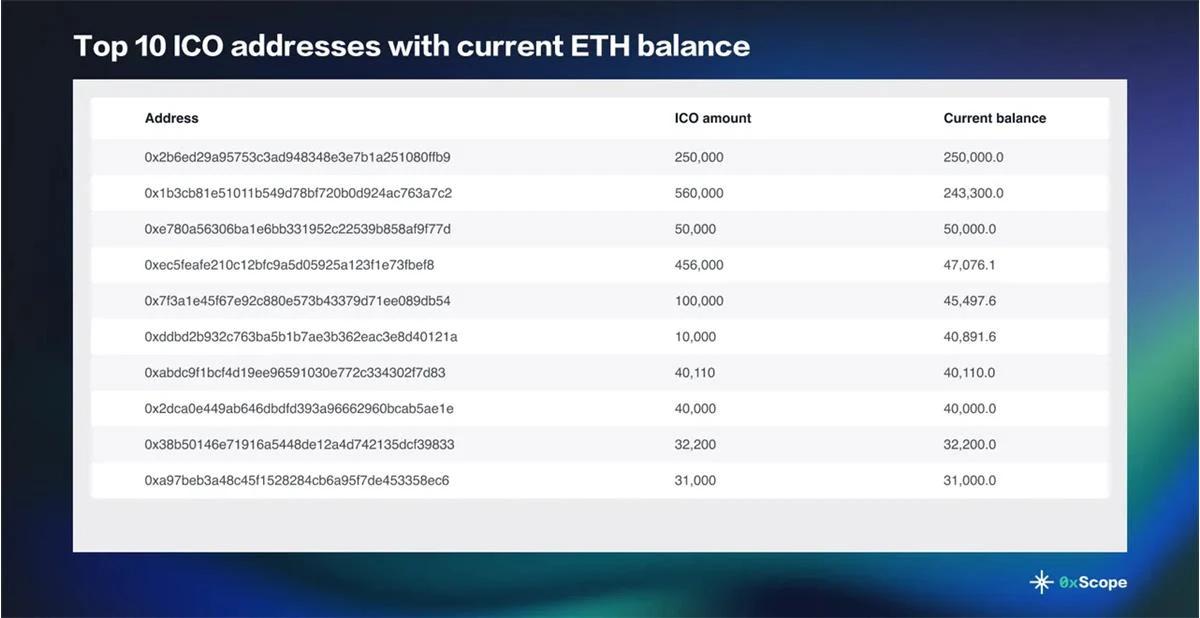 在 8, 891 个在创世区块收到 ETH 的地址中,仍然有一些地址保留着大量的 ETH。所有 ICO 地址的当前总余额为 1, 847, 631 个 ETH。这相当于初始 ICO 金额的 3% 。