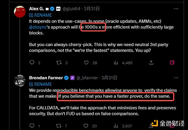 今年3月,Polygon Zero 联创 Brendan 与 zkSync 背后 Matter Labs 的联创 Alex,就zksync的效率问题公开对线,Alex表示zksync的效率会提升1000倍,而 Brendan 则回应"口说无凭,我们一般都拿实际公开的测试指标说话,请你也这么做";