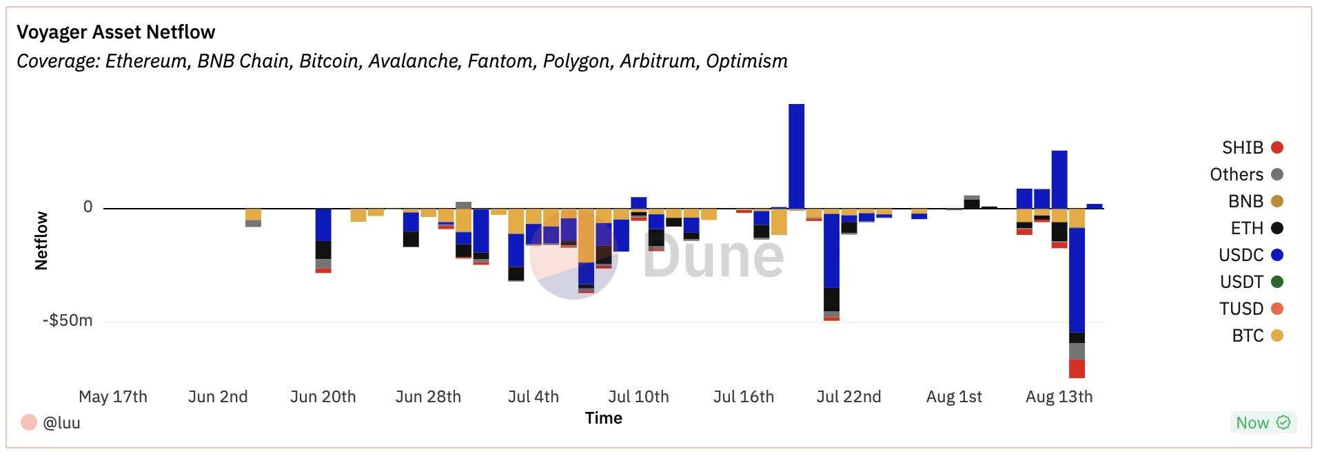 8 月 14 日,单日净流出更是高达 7440 万美元,其中包括 4618 万美元价值的稳定币。