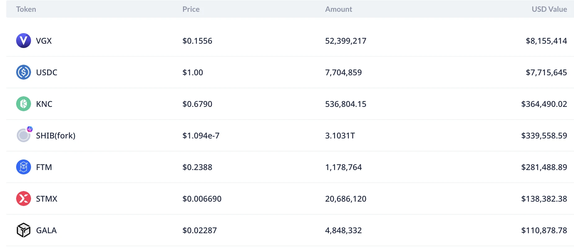 目前 Voyager 仍有价值超过 800 万美元的 VGX 等待出售。持有价值超过 10 万美元的非稳定包括:VGX、KNC、SHIB、FTM、STMX、GALA。