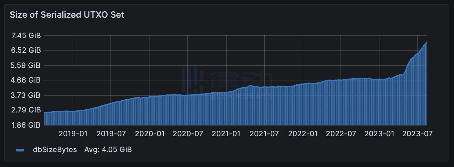 再来看看 BRC 20 ,虽然最近 BRC 20 的热度较几个月之前有所下降,但仍有不小的影响力。自 2023 年 4 月 23 号(BRC 20 开启交易的时候)以来,比特币的 UTXO 集已经从 5 GB 膨胀到了 6.8 GB。