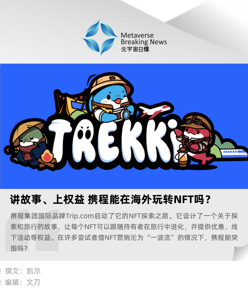 两个月前,携程集团国际品牌Trip.com公布了它的NFT计划。1万枚类海豚形象的Trekki NFT,寄托了它打入Web3领域的野心。携程为这个NFT系列设计了一个关于探索和旅行的故事,让每个NFT可以跟随持有者在旅行中进化,并提供优惠、线下活动等权益。
