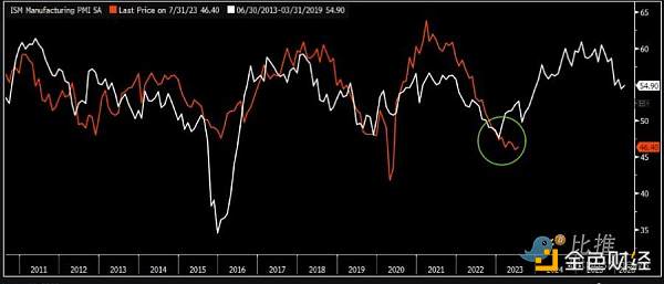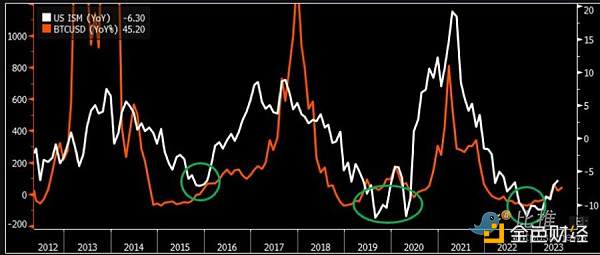 正如US ISM 指数所示,比特币价格峰值与商业周期变化之间存在相关性。