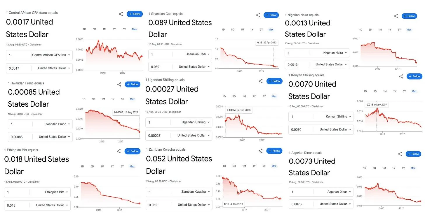 对许多人来说,可能会感到惊讶,但非洲国家的本地货币相对于美元的贬值速度非常快。一些货币,比如津巴布韦的货币,由于恶性通货膨胀而失败。