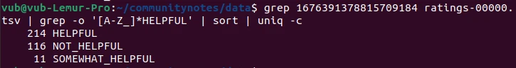 我们还可以通过查看投票本身来以另一种方式来看待这个问题。我们可以扫描 ratings-00000.tsv 文件,以分离出所有针对该 Notes 的评分,并查看有多少评为 HELPFUL 和 NOT_HELPFUL: