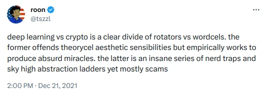当然,我会说加密货币的“理论美学”方面是必要的,因为它能够准确区分那些真正无需信任的协议和那些看起来不错、表面上运行良好,但实际上需要信任一些中心化参与者,甚至更糟的是,可能是彻头彻尾的骗局。