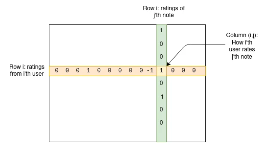 让我们深入了解其工作原理。 我们有一组用户和一组 Notes; 我们可以创建一个矩阵 M,其中单元格 Mij 表示第 i 个用户如何评价第 j 个 Notes。