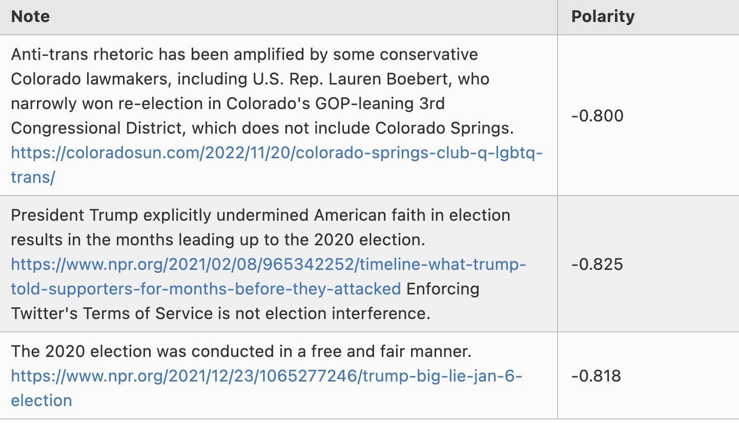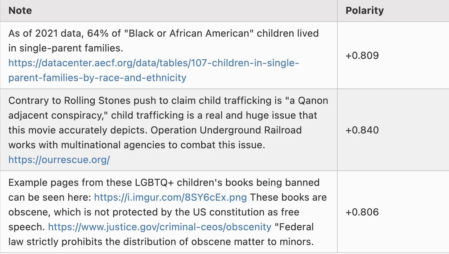 请注意,我在这里并没有精选;这些实际上是我在本地运行算法时生成的 scored_notes.tsv 电子表格中的前三行,它们的极性得分(在电子表格中称为 coreNoteFactor 1)小于 -0.8 。