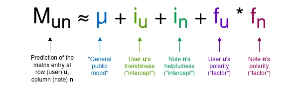 对于任何给定的 Notes,大多数用户都没有对该 Notes 进行评分,因此矩阵中的大多数条目将为零,但这没关系。算法的目标是创建一个用户和 Notes 的四列模型,为每个用户分配两个统计数据,我们可以称之为“友好度”和“极性”,为每个 Notes 分配两个统计数据,我们可以称之为“有用性”和“极性”。该模型试图将矩阵预测为这些值的函数,使用以下公式: