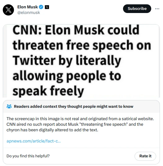 我认为 Community Notes 保守一点是可以的另一个原因是,我不认为每条错误信息的推文,甚至大多数错误信息的推文,都应该收到纠正性的注释。即使不到百分之一的错误信息推文得到提供背景或纠正的注释,Community Notes 仍然作为一种教育工具提供了极其有价值的服务。目标不是纠正一切;相反,目标是提醒人们存在多种观点,某些看起来在孤立状态下令人信服和引人入胜的帖子实际上是相当错误的,而你,是的,你通常可以进行基本的互联网搜索来验证它是错误的。