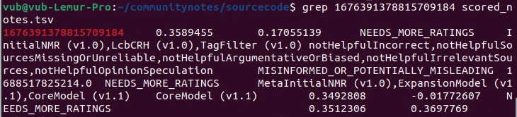 在这里,我们得到了 Notes 本身的 ID, 1676391378815709184 。然后我们在运行算法生成的 scored_notes.tsv 和 note_status_history.tsv 文件中搜索该 ID。我们得到了以下结果:
