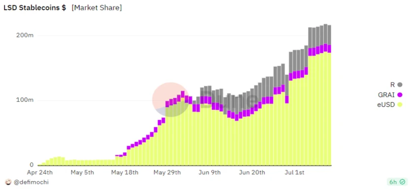 1)发行的稳定币 eUSD 自动生息,可以吸引市场上的 LSD 资金;