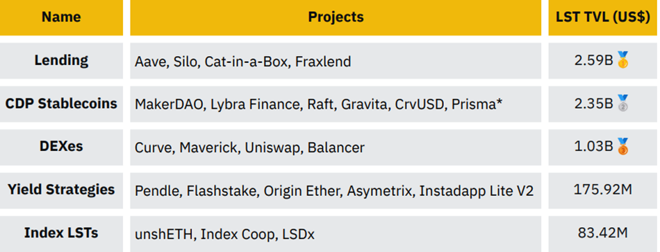 币安研究院在研究报告中指出,老牌 LSDfi 和较新的 LSDfi 的总 TVL 为 6.35 B,老牌协议比较新协议的 TVL 高大约 8.76 倍,较新的协议 TVL 自 2023 年 5 月以来大约增加了 66.1% 。基本上所有的协议都与 stETH 集成,对单一质押物的过度依赖可能导致一种不健康的增长模式。