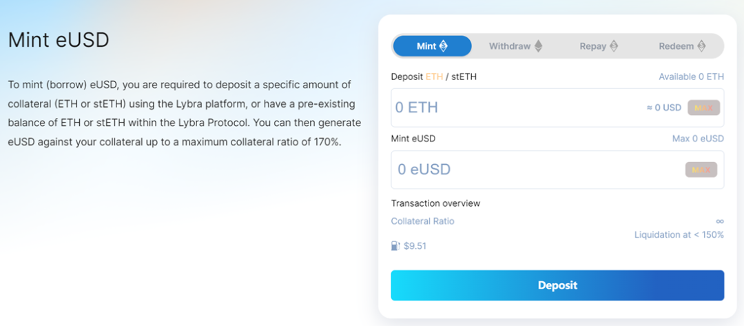 Lybra Finance 是一个 LSDfi 协议,用户可以在协议中充当铸币者、持有者、清算者、赎回者。用户的收益主要来自于持有 eUSD 并获得收益、铸造 eUSD 并赚取 LBR 代币、质押 LBR 并分享协议收入、LP 奖励。目前加密货币市场上的稳定币可以分为三种,一种是法币抵押稳定币,例如 USDT、USDC,这些稳定币通常由中心化机构发行和管理,一般保持 1: 1 的抵押比例,这意味着每发行一个稳定币,就需要质押一个法币作为抵押品;一种是加密货币抵押稳定币,加密货币抵押稳定币是以比特币或以太坊作为底层资产抵押铸造的稳定币,抵押率通常高于 100% ;最后一种是算法稳定币,算法稳定币是使用算法使稳定币保持价格稳定的一类项目,这类项目具有较大的归零风险。Lybra Finance 团队认为稳定币的一个缺点是缺乏利息收入。随着以太坊上海升级,稳定币可以有利息收入。利用流动质押衍生品将可以提供价格稳定且利息稳定的稳定币。Lybra Finance 利用 ETH 和 stETH 作为主要底层资产生成稳定币 eUSD。eUSD 是一种于美元挂钩的稳定币,利息来自于存入 ETH 和 stETH 产生的 LSD 收入,年化收益率约为 7% ~ 9% ,eUSD 的利息收入来自于 eth 的质押收入,目前 steth 的年化是 3.8% ,而 LybraFinance 的最低抵押率是 160% ,所以 eusd 的年化在 7% ~ 9% 之间,项目的整体抵押率越高则越有利于 eusd 持有人的收益越不利于 eusd 铸造者的收益。在没有挖矿收益的情况下,铸造者可能必须反复借贷提高杠杆才能获得比较理想的收益,实际收益可能低于项目方描述。