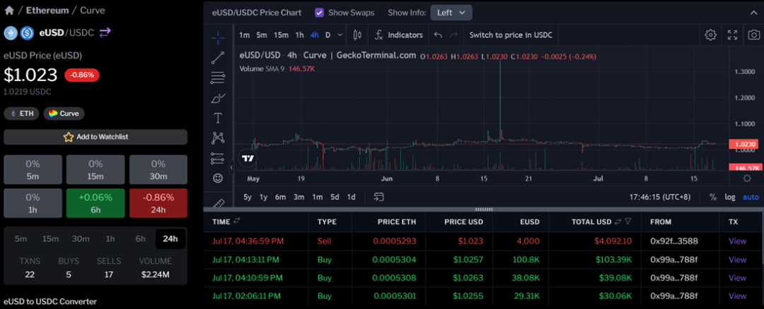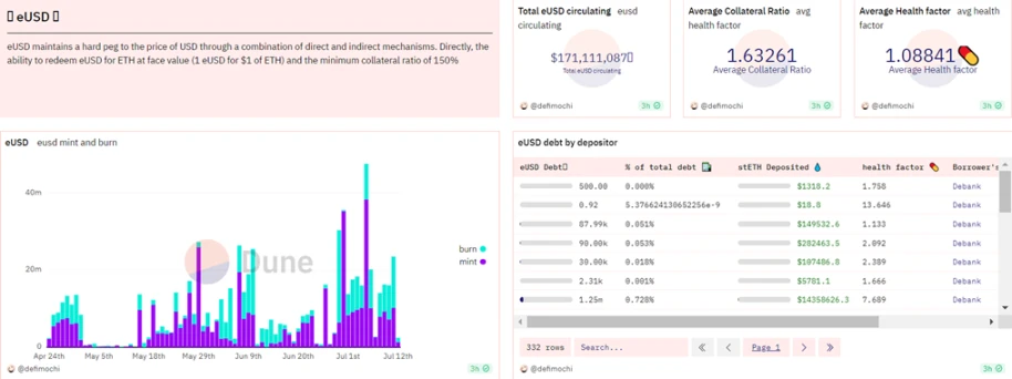 eUSD 产生收益是通过 eUSD 数量的增加实现的,当协议的 stETH 余额因 LSD 收益或其他原因增加时,多余的收入将换成 eUSD 代币,并将换得的 eUSD 代币分发至现有的 eUSD 持有中。通过 stETH 换取的 eUSD 相当于被销毁,其余 eUSD 持有者的余额因为总价值的增加和总股本的减少而增加价值。直接用其他稳定币 USDT、USDC、FRAX 兑换 eUSD 也可以产生收益,eUSD 仅在 Curve 与 USDC 有交易对,单日交易量约在三四十万美元左右,eUSD 的总流通量为 170, 468, 361.77 ,是 eUSD 退出流动性的唯一来源。eUSD 的余额是动态变化的,代表持有者在协议中持有的以太坊份额。关于 eUSD 余额的动态变化如何实现,社区管理员给出的答复是,当协议一天从奖励中获得了 1000 美元的收益,这 1000 美元的 stETH 将会保留在协议范围内。为了将收益分配给 eUSD 持有人,当有人希望用 eUSD 赎回 steth 时,协议会将增值的 steth 给他,拿到他用来赎回的 eUSD 分配给目前的 eUSD 持有者。这个做法有两个疑问,当日产生的 steth 利息不大可能和当日的赎回需求刚好相等,其次持有人在 Etherscan 上没有办法看到 eUSD 的持有信息,所以这些动作可能并不是每天透明地发生在链上。