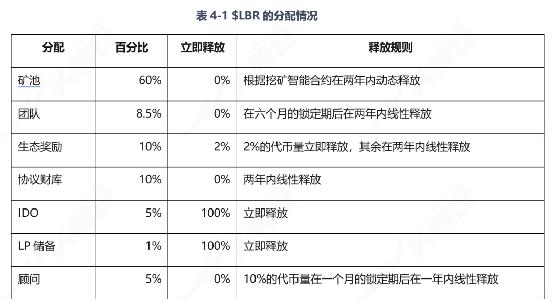 $LBR 是 Lybra Finance 的原生代币,最大供应量为 100, 000, 000 。$LBR 持有者可以参与投票和治理同时分享协议收入,Lybra Finance 的收入来自于 eUSD 总量 1.5% 的服务费,LybraFinance 收取的服务费将按照 LBR 持有者在 LBR 质押池中的比例分配。esLBR 是托管 $LBR,esLBR 的用例有 1)治理;2)获取服务费收益;3)作为奖励分发给目标人群;4)获得财库和协议收入分配。esLBR 的存在主要是为了减少 $LBR 的抛压。