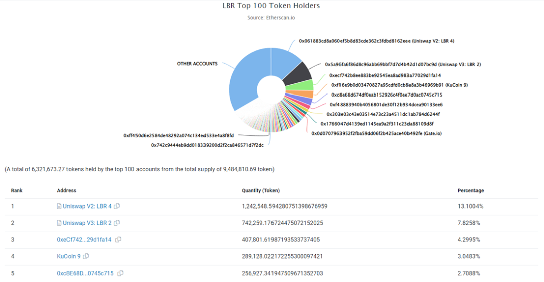 $LBR 的前百名持有人持有代币占到总代币数量的 66.6% ,相比较其他项目的代币而言集中度较低。排名前五的持有人地址基本为中心化交易所和去中心化交易所的地址,$LBR 的主要交易场所在 Uniswap。