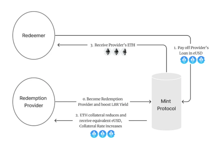 使用 eUSD 直接兑换 ETH 被称为刚性赎回,在此过程中用户需要付出 0.5% 的费用,以促进用户去还债而不是直接刚性赎回,但这有可能造成 eUSD 向<1 美元偏移,刚性赎回不等于偿还债务,如果发生赎回,开启赎回模式的用户将损失一部分抵押品并同时减少相应债务,也能获得 0.5% 的赎回费用。这意味着,开启赎回模式的抵押品将成为其他用户的退出流动性。