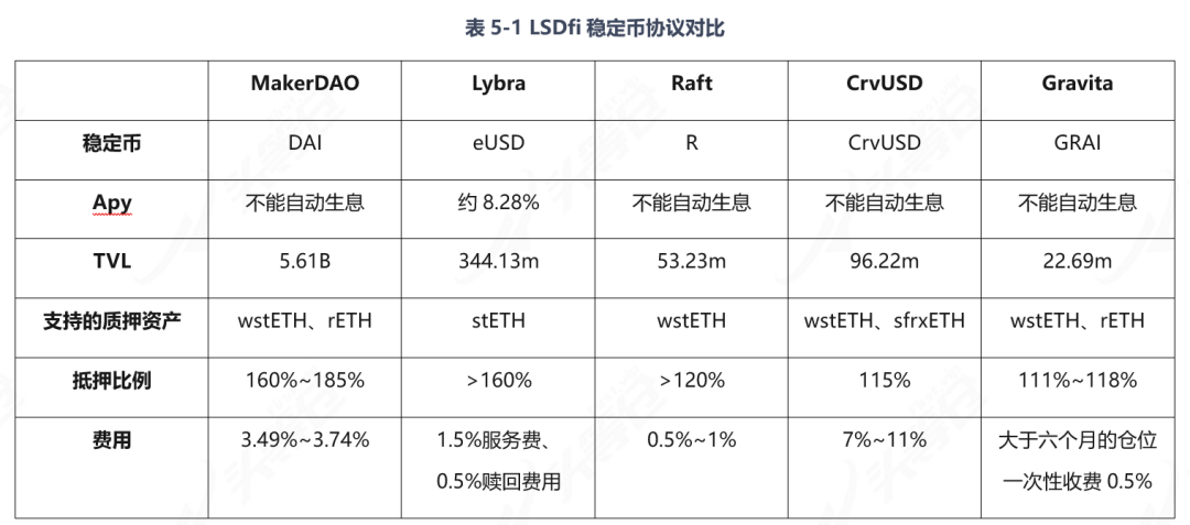 总结:LSDfi 代币占比金额排名分别是 stETH、wstETH、sfrxETH,用户需要注意的是 wstETH 等包装代币可以保留 ETH 的质押收益直接存 stETH 则不能。LSDfi 的 TVL 取决于 ETH 的总市值和 ETH 产生的衍生品数量,随着 MakerDAO、Curve 等老牌 Defi 协议开始下场做 LSDfi,相关赛道的竞争逐渐白热化。LSDfi 的主要发展方向有借贷、稳定币、DEX、收益策略、LSD 指数产品等。总的来看,借贷和稳定币的发展情况较好,总 TVL 均超过 20 亿美元。Raft、Gravita 等常规稳定币协议除了在抵押比率和手续费上有一定操作空间以外,其余方面比起 MakerDAO 并无任何优势,并且 MakerDAO 的稳定币 DAI 拥有较多的应用场景和退出流动性,因此这类常规的 LSDfi 协议可能发展情况一般。