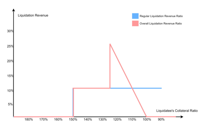 铸币要求用户的抵押率应高于安全抵押率 160% ,抵押率取决于以太坊价格,如果以太坊价格下跌账户有可能遭遇清算。此外产品还具有整体抵押率的概念,整体抵押率是指协议中所有抵押品的总价值与 eUSD 总供应量的比率。如果整体抵押率跌破 150% ,那么所有抵押率低于 125% 的用户都有可能遭遇清算。