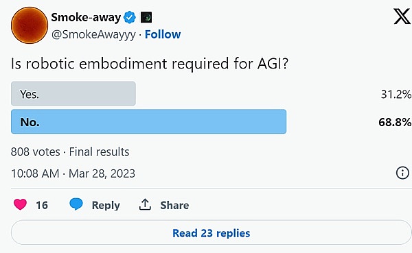 一部分研究人员认为,化身人类,拥有与环境互动和感知信息的能力,对发展AGI至关重要。人形机器人能拥有智能大脑,在社会不需要改变的情况下就能融入与参加。但也有一部分人认为,在没有“身体”的情况下,仍然可能实现AGI。然而,当下还没有足够的研究来证明这两种截然不同的观点。