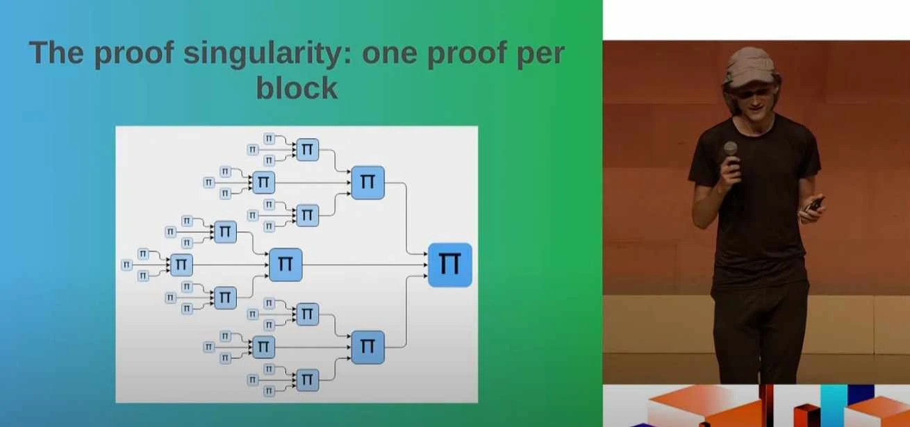 在 EthCC 模块化峰会上,Vitalik 谈到了 L2 环境下的证明聚合。在下面的设计中,末端的证明只是签名 / 隐私协议,中间的证明是聚合证明,然后第二层证明将聚合证明聚合,最后有一个总体的主证明被传输到 L1。通过证明聚合,我们可以极大地降低成本并优化证明过程。