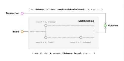 交易是用户希望执行的高度具体操作,而意图则规定了用户在某些参数内希望实现的目标。通常,意图将手头的任务外包给用户,并能够访问多个环境,这样用户就不必手动操作零散的协议。通过不对每个交易的方方面面进行编码,可以实现更多的交易表现力和效率,并提高 UX。