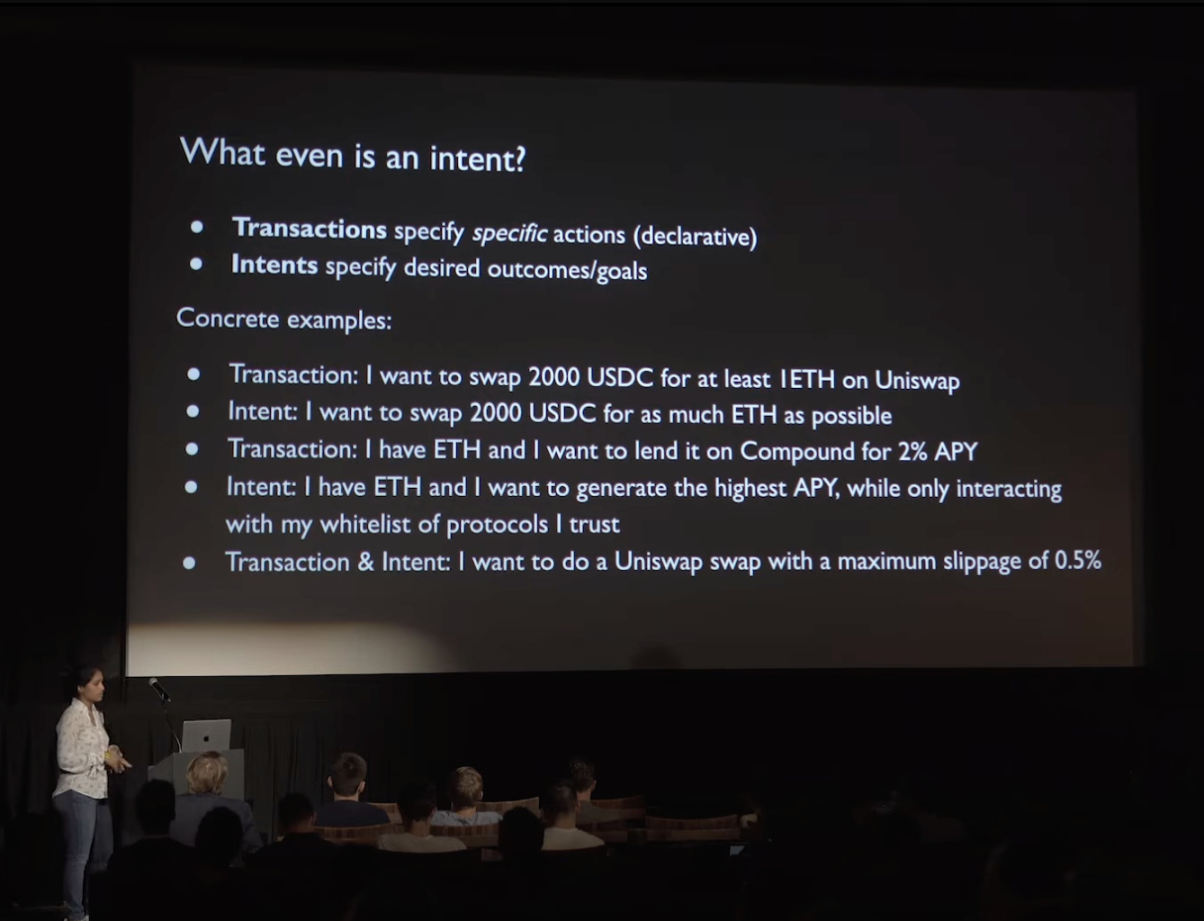 Succinct 的 Uma Roy 在她关于意图、SUAVE、AA 和跨链桥接的演示文稿中给出了交易与意图的伟大具体示例: