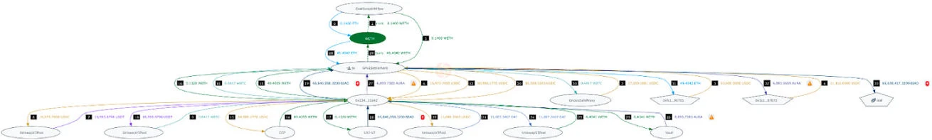 PropellerHeads 正在精进意图架构的一个特定元素 - 解算人。通过使用 PropellerSDK,特别是他们的 Solver API 和 Private RPC,用户更加受到 MEV 的保护,并在交易中获得更好的价格。Solver API 返回通过插入许多流动性来源并运行优化算法来寻找最佳路线以获得最佳价格的最佳路线。一个由解算人完成的 4 个订单进入 1 个路线的路由组合示例:
