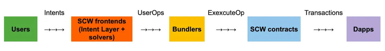 账户抽象:本质上,账户抽象作用于升级 EOAs(外部所有账户,当前用于交易生成的标准),使它们可以由智能合约钱包管理,或者替代地,使智能合约能够直接启动交易。对于意图,这一新范式意味着意图层可能会从 dapps 直接转移到用户的智能合约钱包,随着意图变得更加成熟和复杂。Stanley He 在此提出了这一论点,指出为了使 AA 与意图协同工作,可能存在一种意图 → userOp → 打包程序流程(意图首先流经钱包前端):