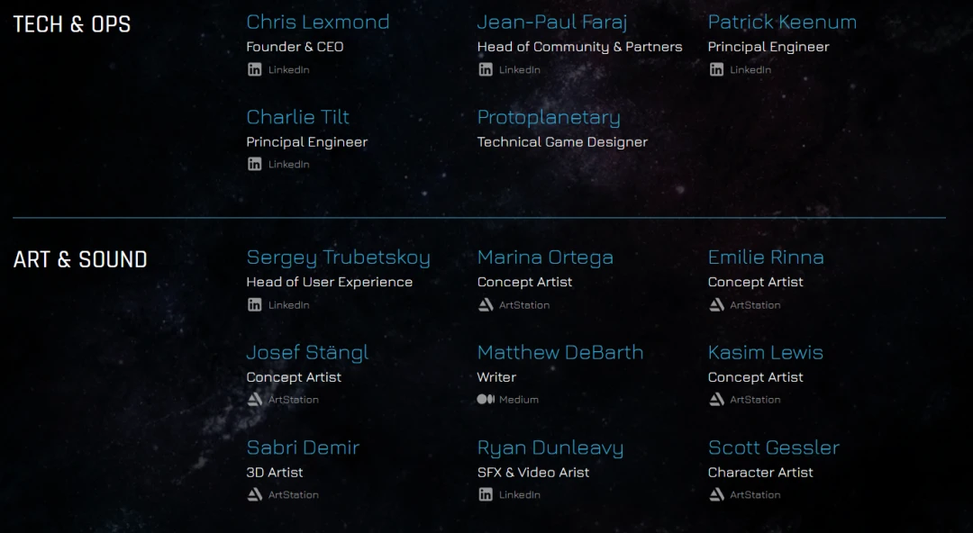 网上基本上没有关于目前开发该项目的团队的信息。该项目的官方推特由一个或多个化名“The Sheperd”的匿名人士运营。他们在每条推文后都会用化名签名,不会留下任何关于他们是谁的线索。尽管缺乏实名团队,Twitter 仍然很活跃,The Shepherd 不断发送更新并分享对游戏的想法。