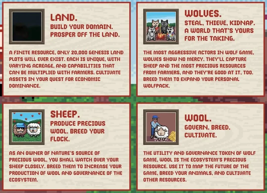 整个游戏生态系统中只有有限的土地供应,每块土地都是一个 NFT。狼的稀有度决定了它们偷取新的铸造品的几率。玩家可以通过剪毛或解除抵押来获得 WOOL 代币,并且可以使用这些代币铸造新的动物。同时,游戏还引入了风险协议,使玩家需要权衡利益和风险。