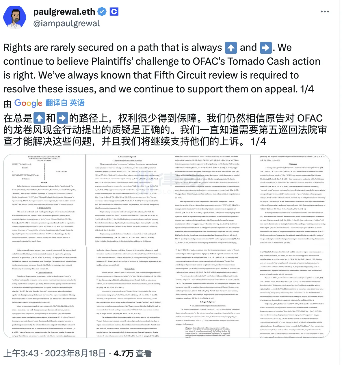 2023 年 8 月 17 日,尽管有 Coinbase 等巨头的支持,由以太坊核心开发者和 Coinbase 员工在内的六人组成的团队,在指控美国财政部(OFAC)制裁 Tornado Cash 时超出权限的诉讼还是失败了。
