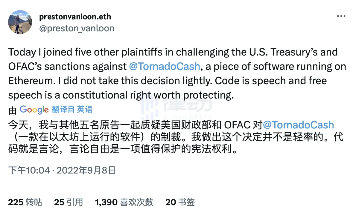 该诉讼是对 2022 年美国财政部的海外资产控制办公室(OFAC)对隐私平台 Tornado Cash 制裁的回应。此前,美国财政部的海外资产控制办公室(OFAC)将部分与 Tornado Cash 协议或与之相关的以太坊地址进行交互的地址,放入 SDN (美国特别制定国民名单)制裁名单之中。