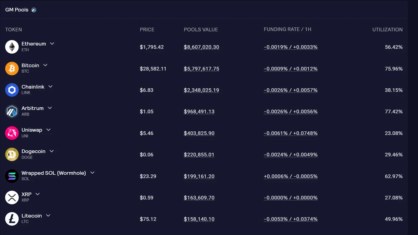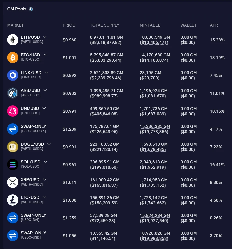 GMX V2的流动性池子称为 GM 池,各个池子互相独立。可以在官网看到每个池子的资金量、资金费率和资金利用率。