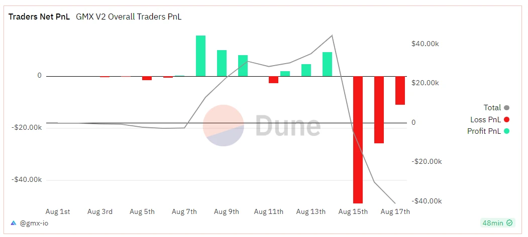 GMX V2交易者目前处于净亏损状态,累计净亏损额度是 4 万美元。