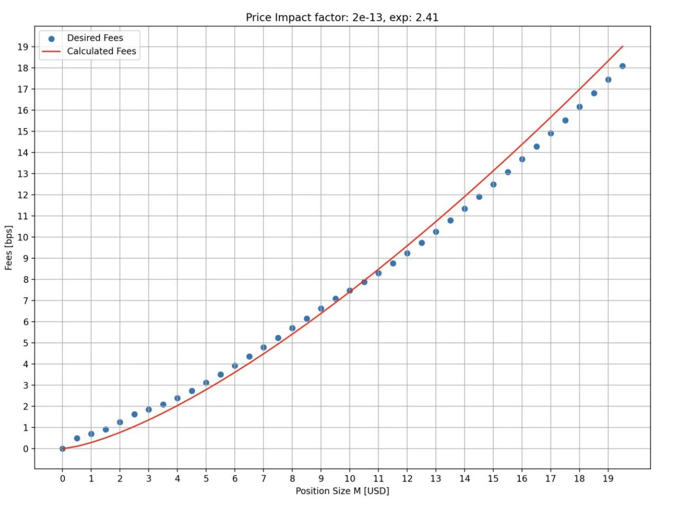 下图显示了模拟状态下不同的开仓规模所面临的价格影响费率,可见仓位越大,费率越高。横轴是开仓规模(百万美元),纵轴是费率(bps)。