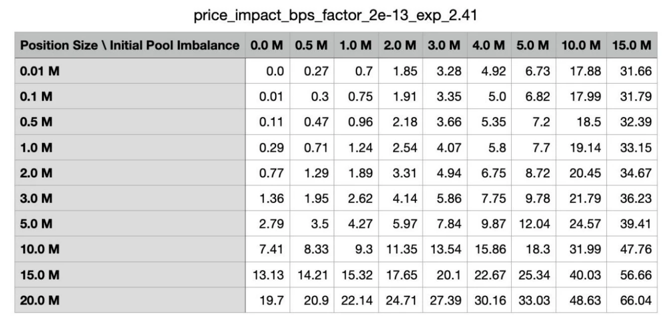 此外,如果开仓对多空平衡越不利,费用也会越高。下表显示了在模拟状态下不同的多空平衡状态下,收取的费用。首列是开仓规模,首行则是初始池子不平衡仓位的规模。