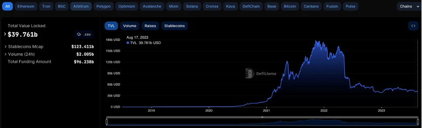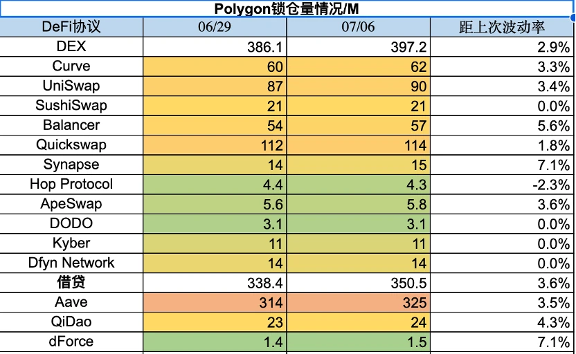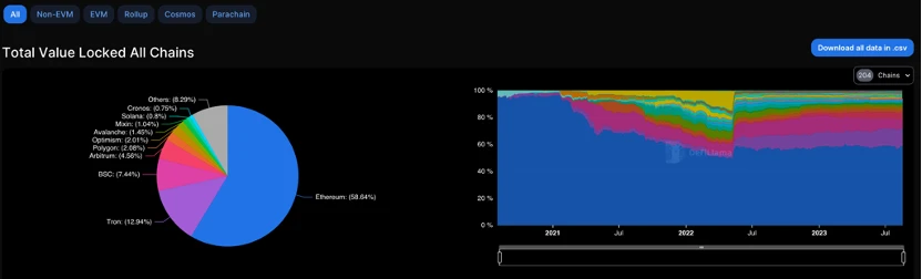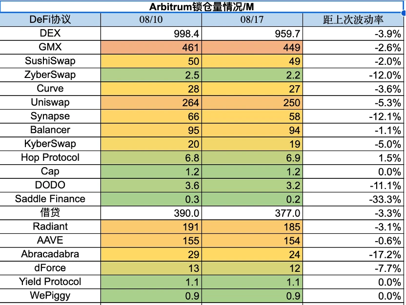 本周 TVL 整体下降 1.9 b,降幅达 4.6% ,近几周 TVL 总量都在底部震荡,没有上升趋势。本周 ETH 链占比与上周基本持平,小幅上涨 0.6% 。Layer 2 各公链的 TVL 全部都在下跌,其中 Arbitrum 下跌 8.1% ,Optimisim 下跌 8.7% ,幅度最大。整体看,只有 Solana 没有下跌,涨幅近 0.1% 。 Base 链的 TVL 本日有 7% 的上涨,近 7 天上涨幅度 222% 。