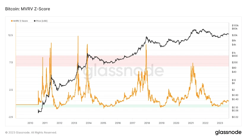 长期趋势指标 MVRV-ZScore 以市场总成本作为依据,反映市场总体盈利状态。当指标大于 6 时,是顶部区间;当指标小于 2 时,是底部区间。MVRV 跌破关键水平 1 ,持有者总体上处于亏损状态。当前指标为 0.61 ,进入复苏阶段。