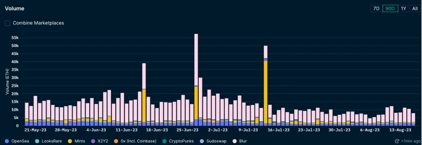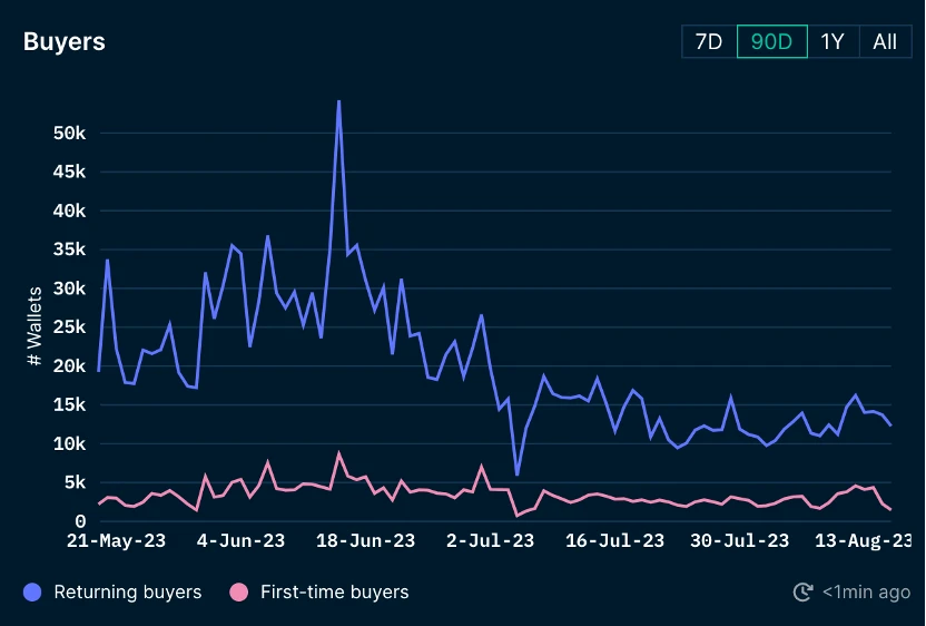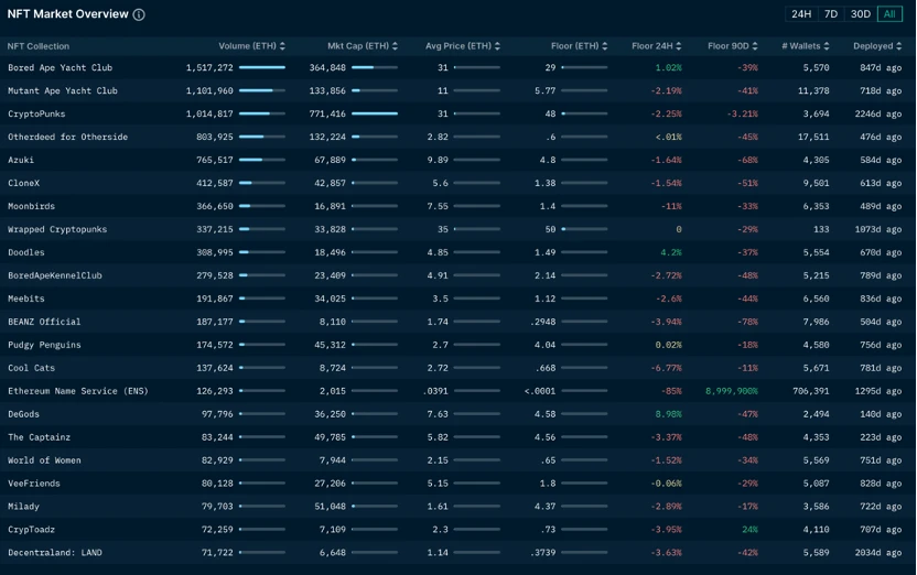本周蓝筹项目的地板价基本都在下跌,本日仅 BAYC 有小幅 1% 的上涨。从中长期看,近 90 天蓝筹 NFT 的地板价都在断崖式下跌,其中不少项目跌幅超过 50% 。整体 NFT 市场 Volume 在不断缩小,从 NFT 新老买家的活跃钱包地址看,新老用户均在下降,并且没有新用户的流入将会是很大的挑战。