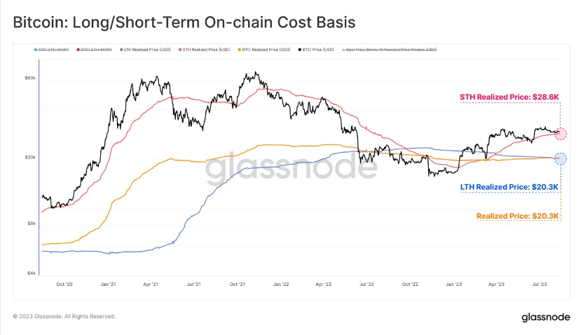BTC 市场继续在历史低波动范围内交易。事实上大多数 BTC 交易者仍处于水下状态。目前六个月内的短期交易者成本为 28600 美元,长期交易者成本要低得多为 20300 美元。预计 BTC 市场短期主要在此区间横盘波动。