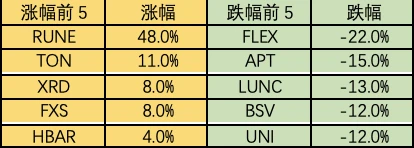RUNE: THORChain 是基于 Cosmos 生态的跨链 Defi,近期上线借贷业务,同时变成通缩模型。THORChain 在上轮牛市曾经较为活跃,因为其经济模型自带三倍杠杆,助涨助跌。