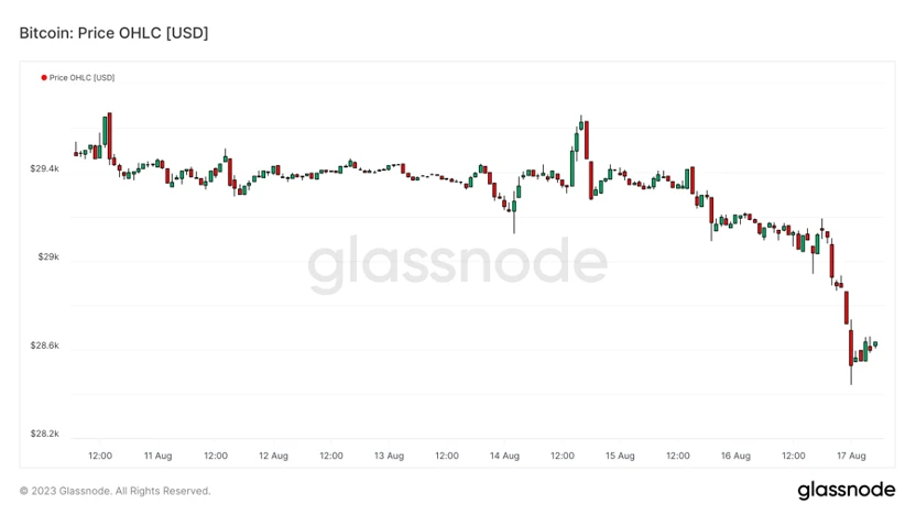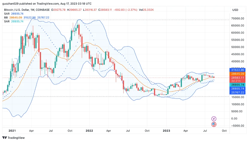 本周 BTC 日线破位下跌。上周美国 SEC 未批准 BTC 现货 ETF,反弹未能创出新高,市场继续延续跌势。波动率降至历史低位,波动性压缩之后通常伴随巨大的价格冲击。市场短期在美联储 9 月加息决策前,大概率跟随美股调整,这将是牛市前上车的较好时机。