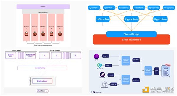 以下是 @zksync 的超级链、@OxPolygonDeFi 的超级网络和 @Starknet 的架构设计的示例。核心概念是:‘无限’扩展、共享桥接,以及在每个单独的 Rollup 之间聚合成本。