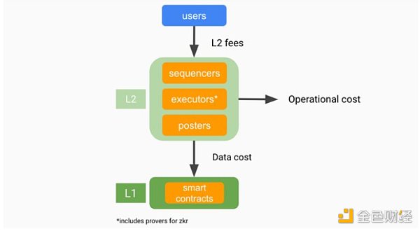 其工作原理:这张流程图展示了用户支付 L2 费用(燃气成本)、运营成本(计算成本、服务器等)以及数据成本(将交易处理回 L1)。